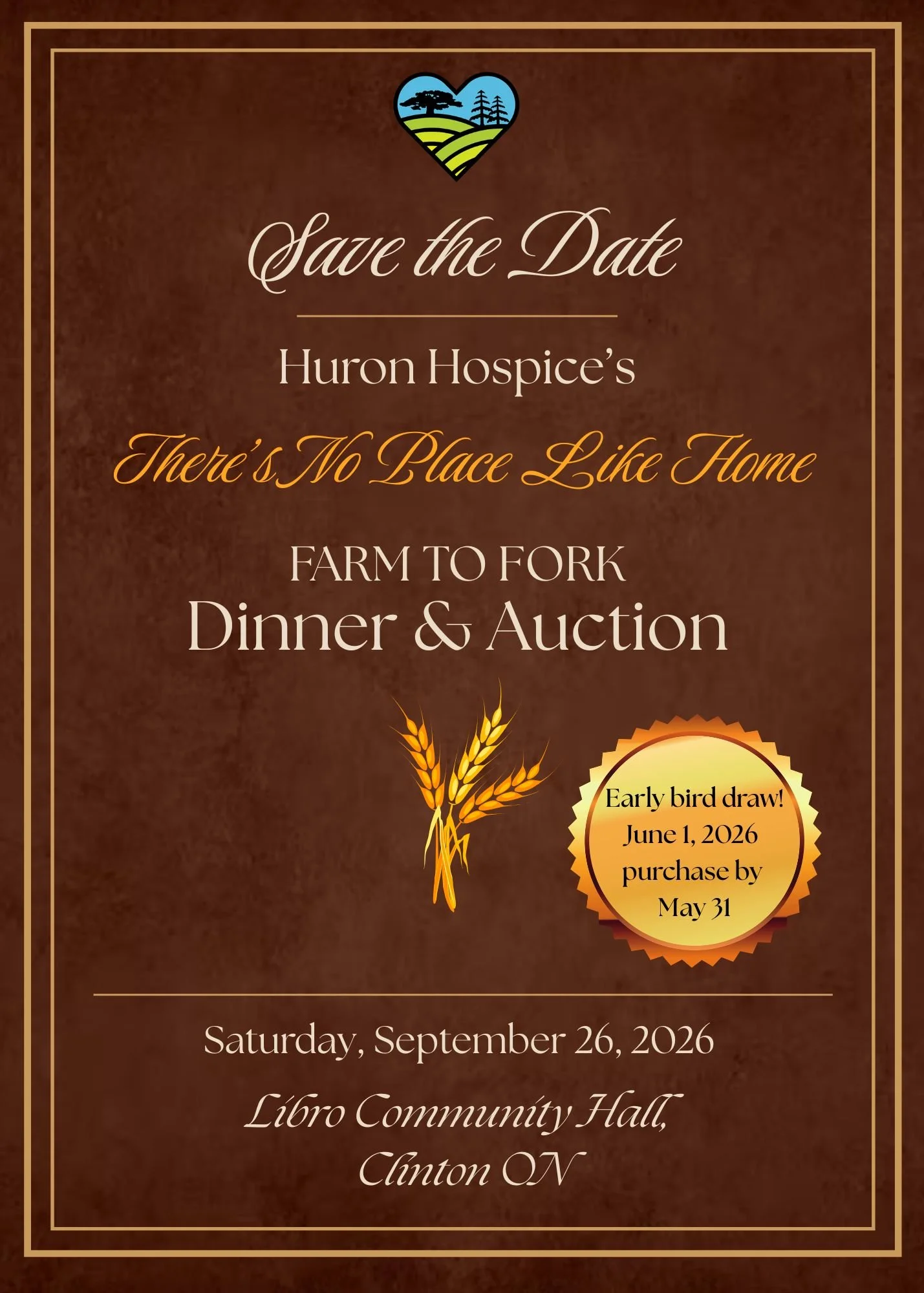 September 26, The annual No Place Like Home Dinner and Auction, 5:30 pm -10:00 pm. Libro Hall, Clinton, ON