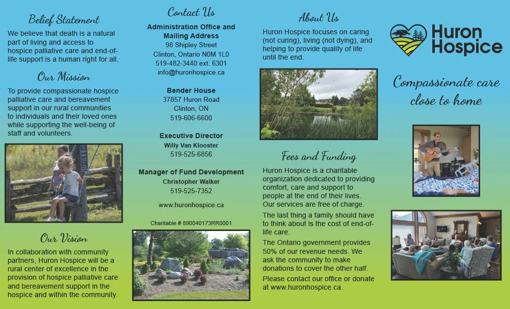 Last week, Lindsay Nuhn and I (Christopher Walker) sat down with Phil and Ally Campbell-Main to talk about Huron Hospice. We wanted to take time to explain what happens at Huron Hospice Bender House and dispel some myths about hospice care. We want to encourage people to consider Huron Hospice as an option when the end of life nears. If you have questions, call Christopher at 519-525-7352 chris.walker@huronhospice.ca